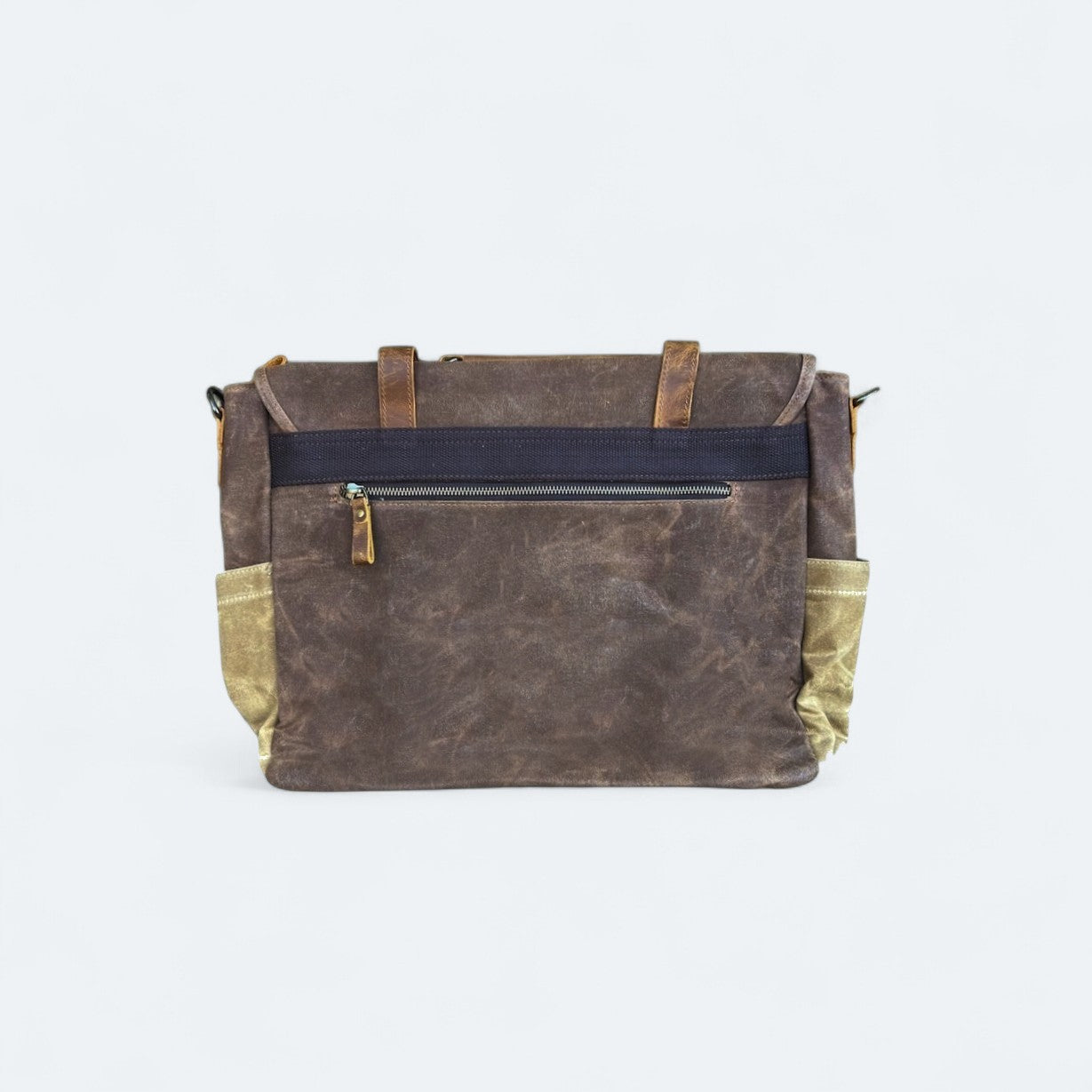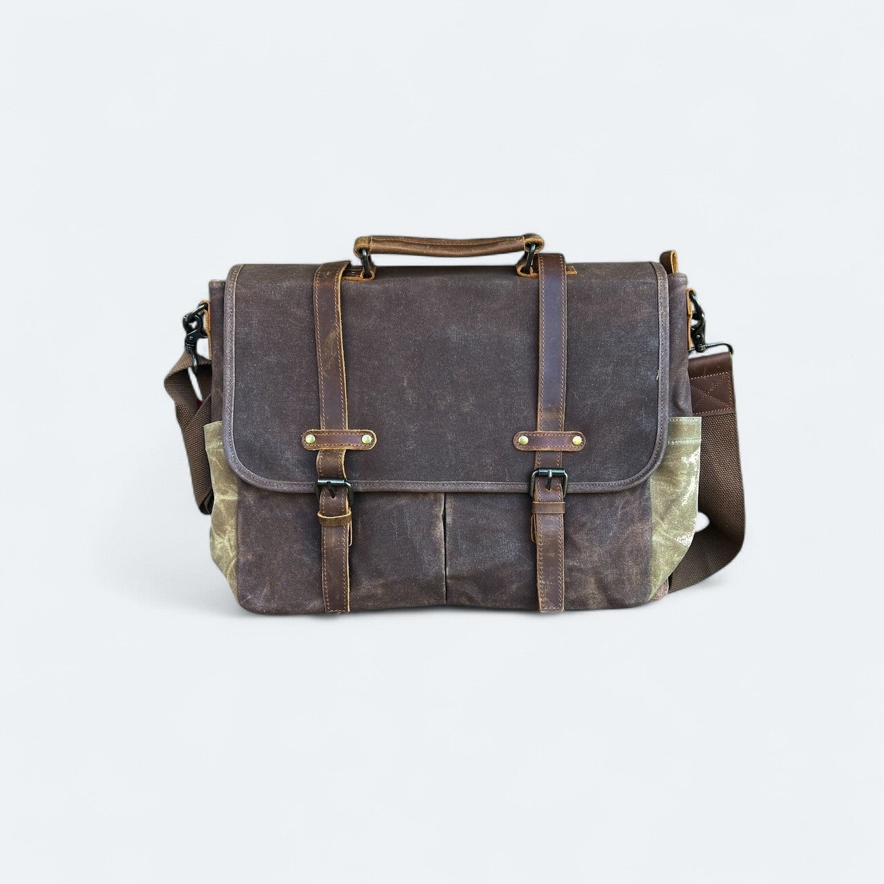 Maletín de lona encerada con un diseño vintage, impermeable y sofisticado. Perfecto para llevar tus objetos esenciales con estilo y comodidad. Su tamaño compacto y funcionalidad lo hacen ideal para cualquier ocasión.